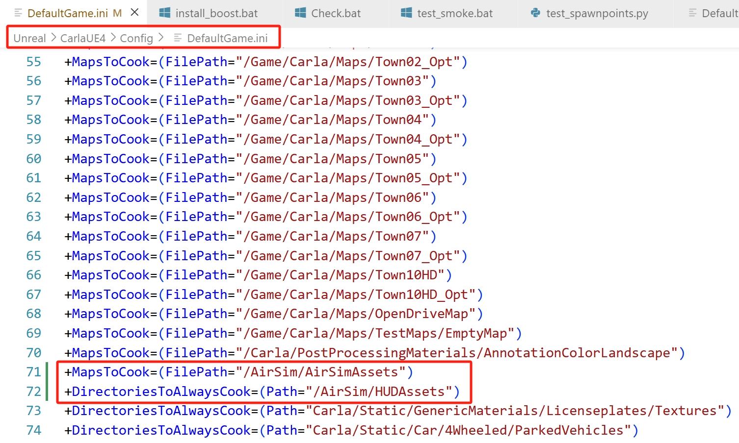 使用记事本打开 hutb\Unreal\CarlaUE4\Config\DefaultGame.ini 文件,在打包地图的后面添加 +MapsToCook=(FilePath="/AirSim/AirSimAssets"),以确保虚幻场景工程可以识别 AirSim 的资源,并将其包含进来,如下图所示。修改后保存并关闭文件。