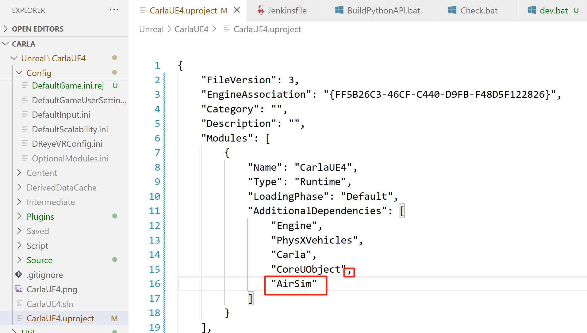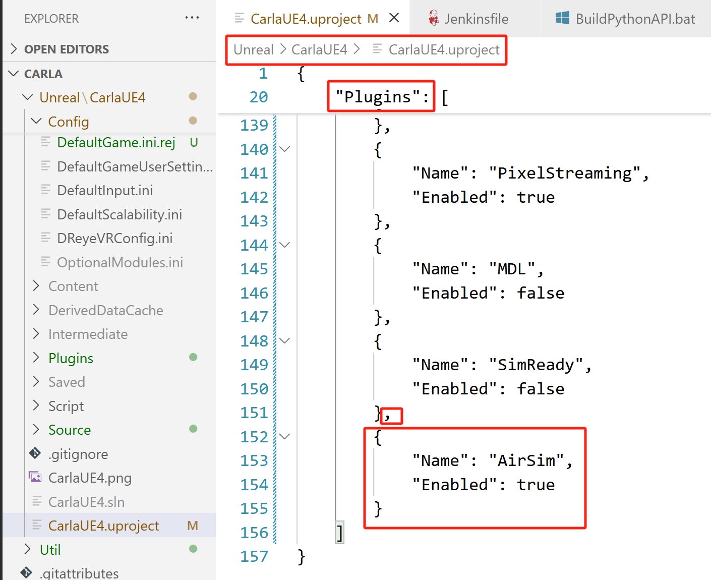 然后打开 hutb\Unreal\CarlaUE4\CarlaUE4.uproject 文件,修改其中的内容,如下图所示,添加 AirSim 的插件支持(注意一定要用英文输入法,同时注意不要忘记逗号等分隔符,如果这里修改的有语法错误,则后面可能会出现错误)。修改完之后保存并关闭文件。