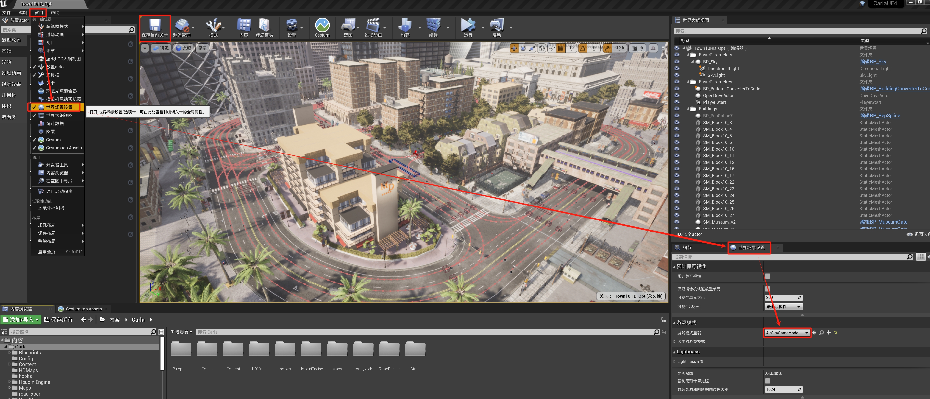 在关卡编辑器中,将右侧 世界场景设置 中的 游戏模式重载 设置为 AirSimGameMode,如下图所示。点击 保存当前关卡 来保存设置好的环境,这样以后再次打开时就不用再次设置 游戏模式重载 了。