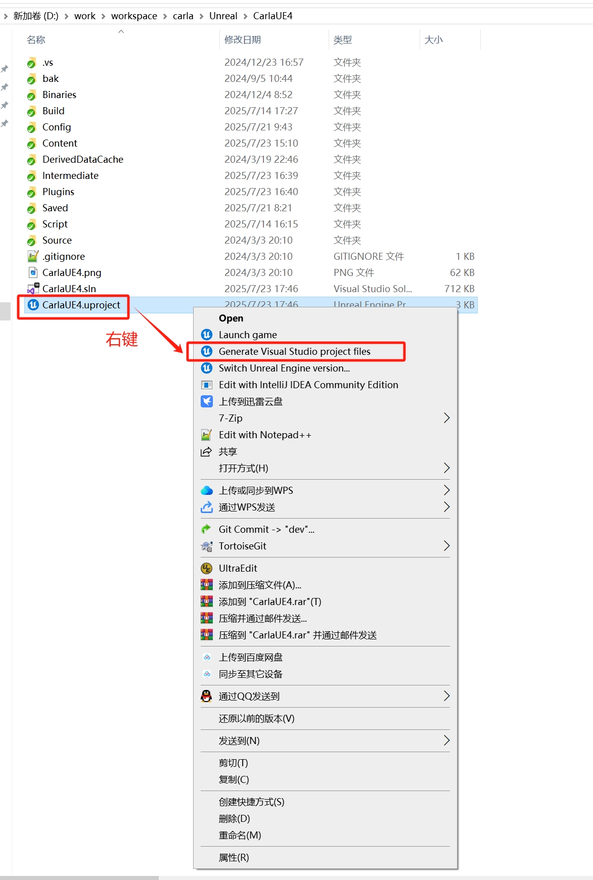 (可以不做)右键点击 hutb\Unreal\CarlaUE4\CarlaUE4.uproject 文件,选择“显示更多选项”,然后选择 Generate Visual Studio project files 选项,如下图所示。这一步会自动检测所有的插件和源文件,并且生成 .sln 工程文件。