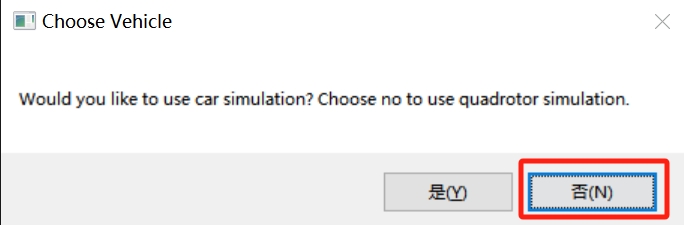 如下图所示,点击工具栏中的 “运行”,就可以运行仿真了,在跳出的对话框中点 “否”。如果是场景是可执行文件,可以在当前文件夹中添加配置文件settings.json,可以跳过选择步骤。