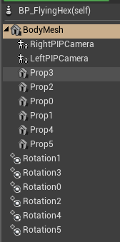 我所做的是复制并粘贴 BP_FlyingPawn,将其命名为 BP_FlyingHex,然后添加另外 2 个道具和另外 2 个旋转,如下所示: